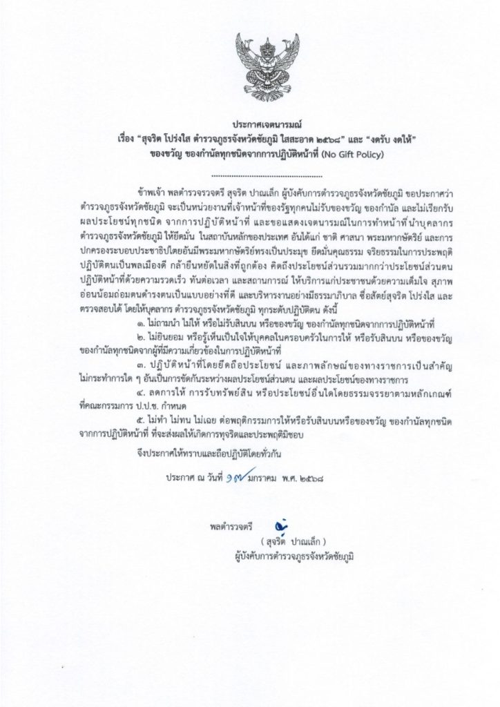 (No Gift Policy) ตำรวจภูธรจังหวัดชัยภูมิ